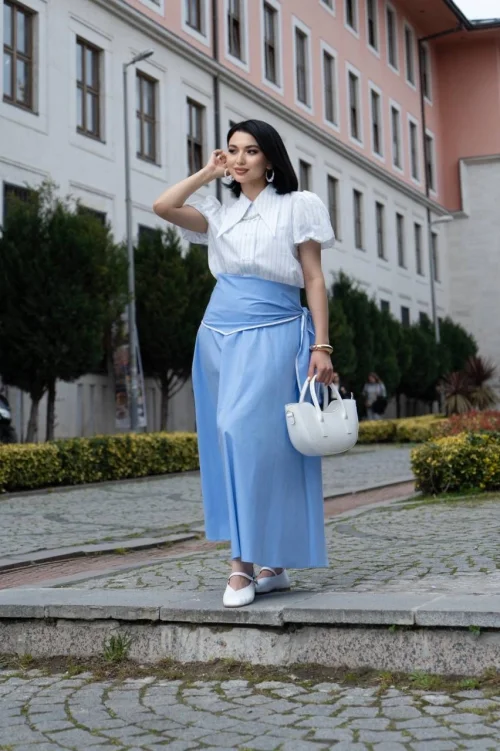 Длинная голубая юбка с поясом на завязках