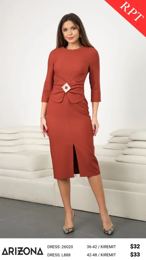Приталенное платье с декоративной пряжкой, рукав 3/4