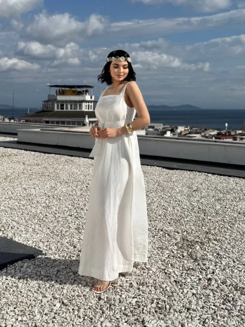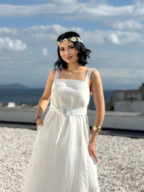 Длинное льняное платье с квадратным вырезом и поясом