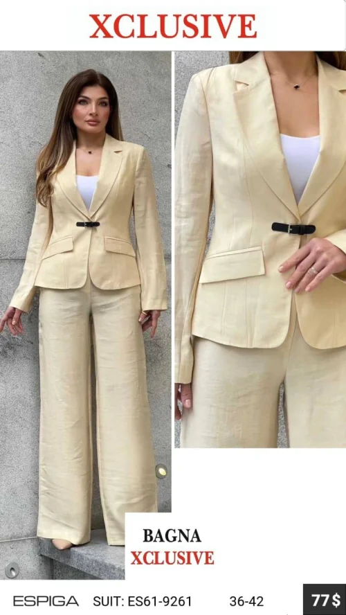 Женский льняной костюм: приталенный жакет и широкие брюки.
