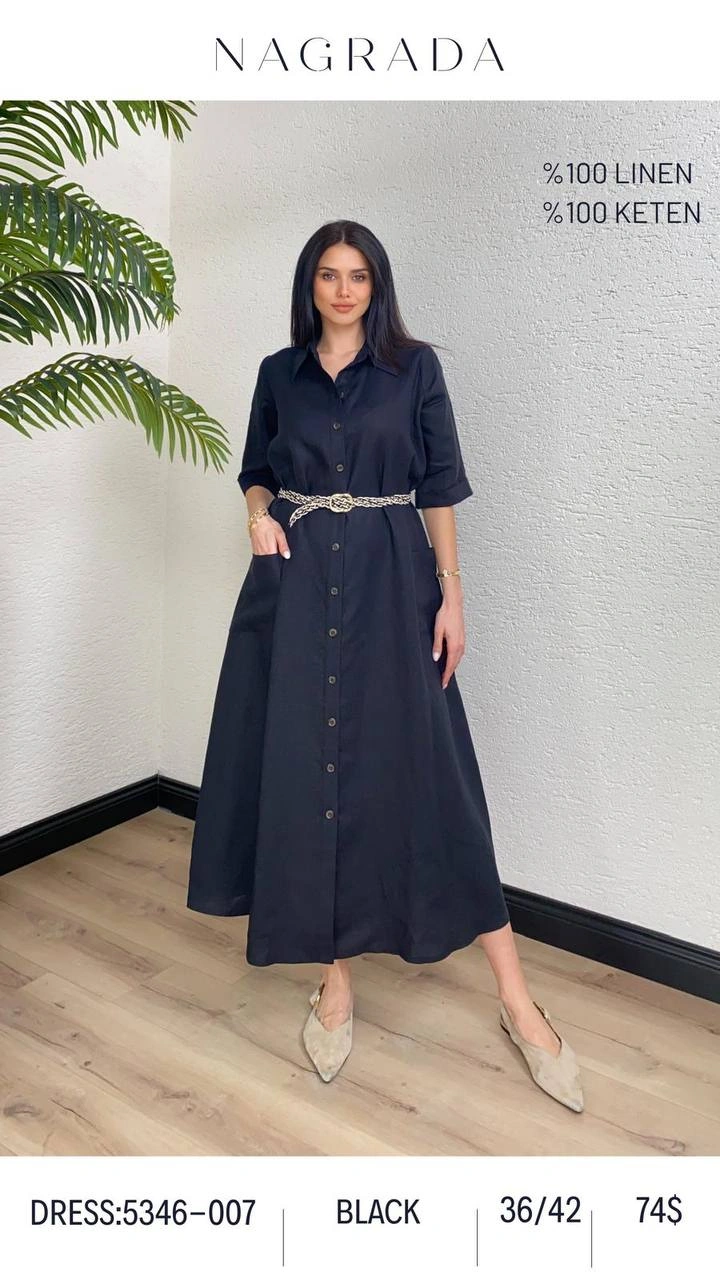 Длинное платье-рубашка с поясом и декоративным цветком