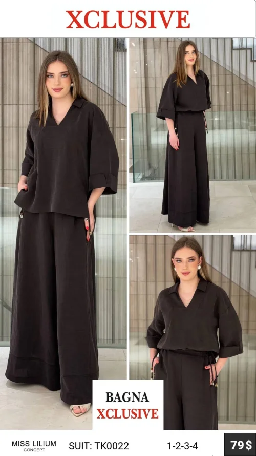 Свободный комплект: туника с V-вырезом и широкие брюки.
