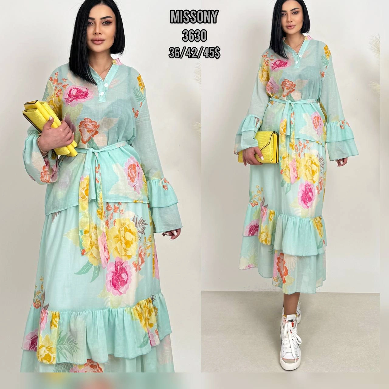 Костюм свободного кроя с V-вырезом и широкими брюками.