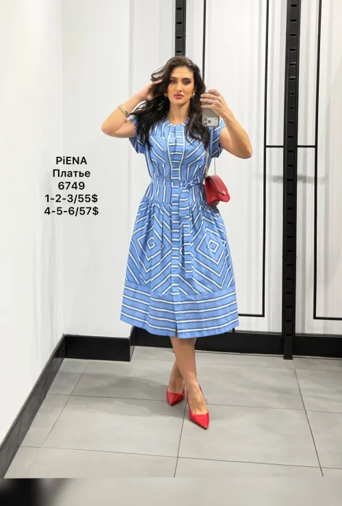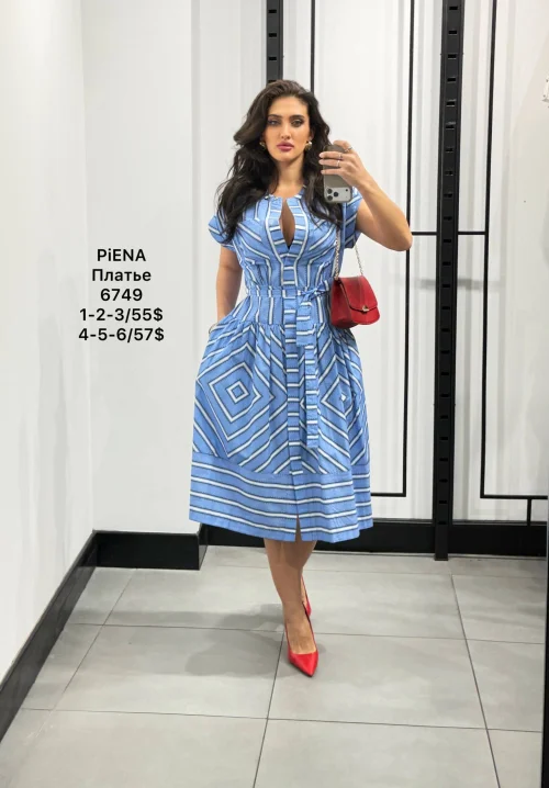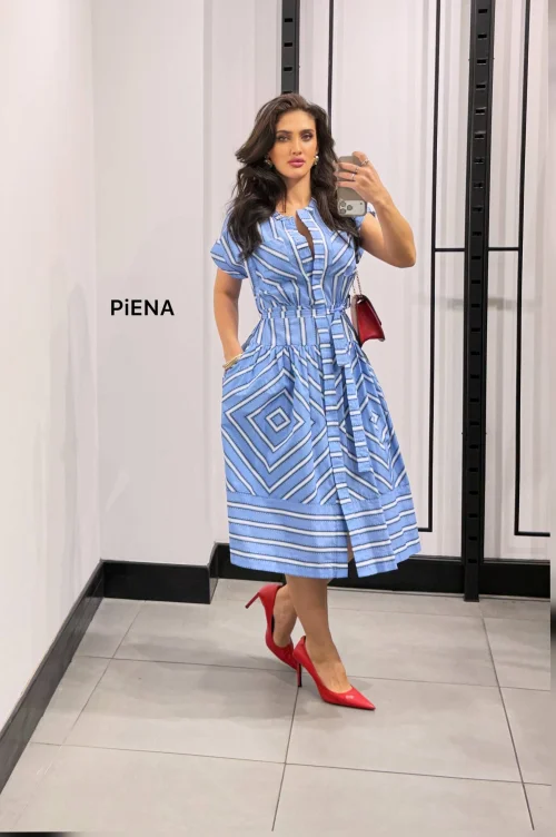 Платье в голубую геометрическую графику, пояс
