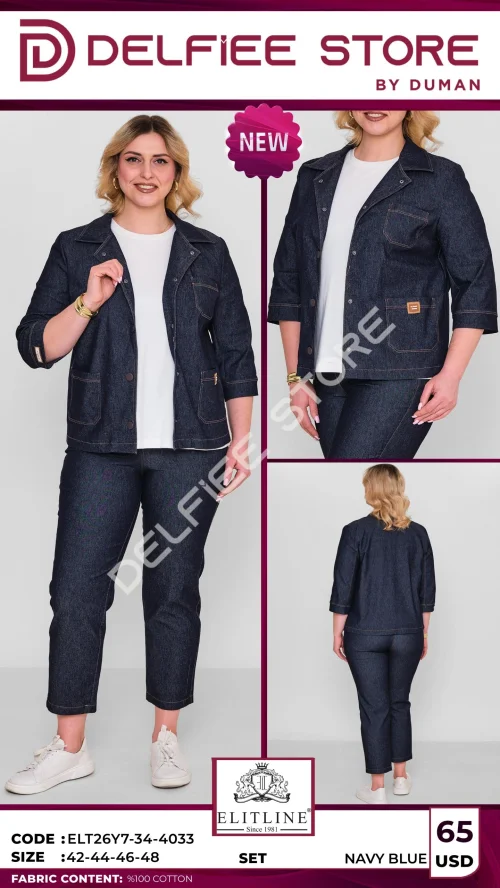 Женский джинсовый костюм темно-синего цвета с укороченными рукавами